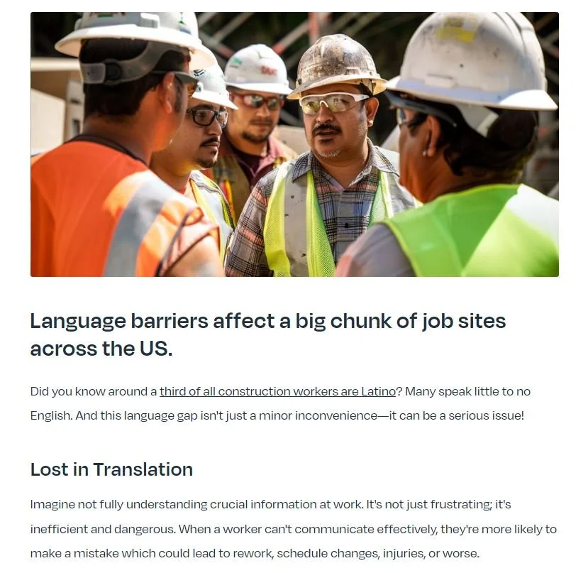 I collaborated with our outsourced writer to ensure all blog and social content aligned with our brand voice and avoided sounding overly corporate. When promoting the new “automatic Spanish translation” feature, I shifted the focus from product specs to real-world impact. After gathering insights from the Customer Success team, I uncovered a story about Spanish-speaking construction workers needing secondary huddles to understand plans. I restructured the blog around this narrative and paired it with an AI-generated visual, highlighting how the feature solved a genuine problem.