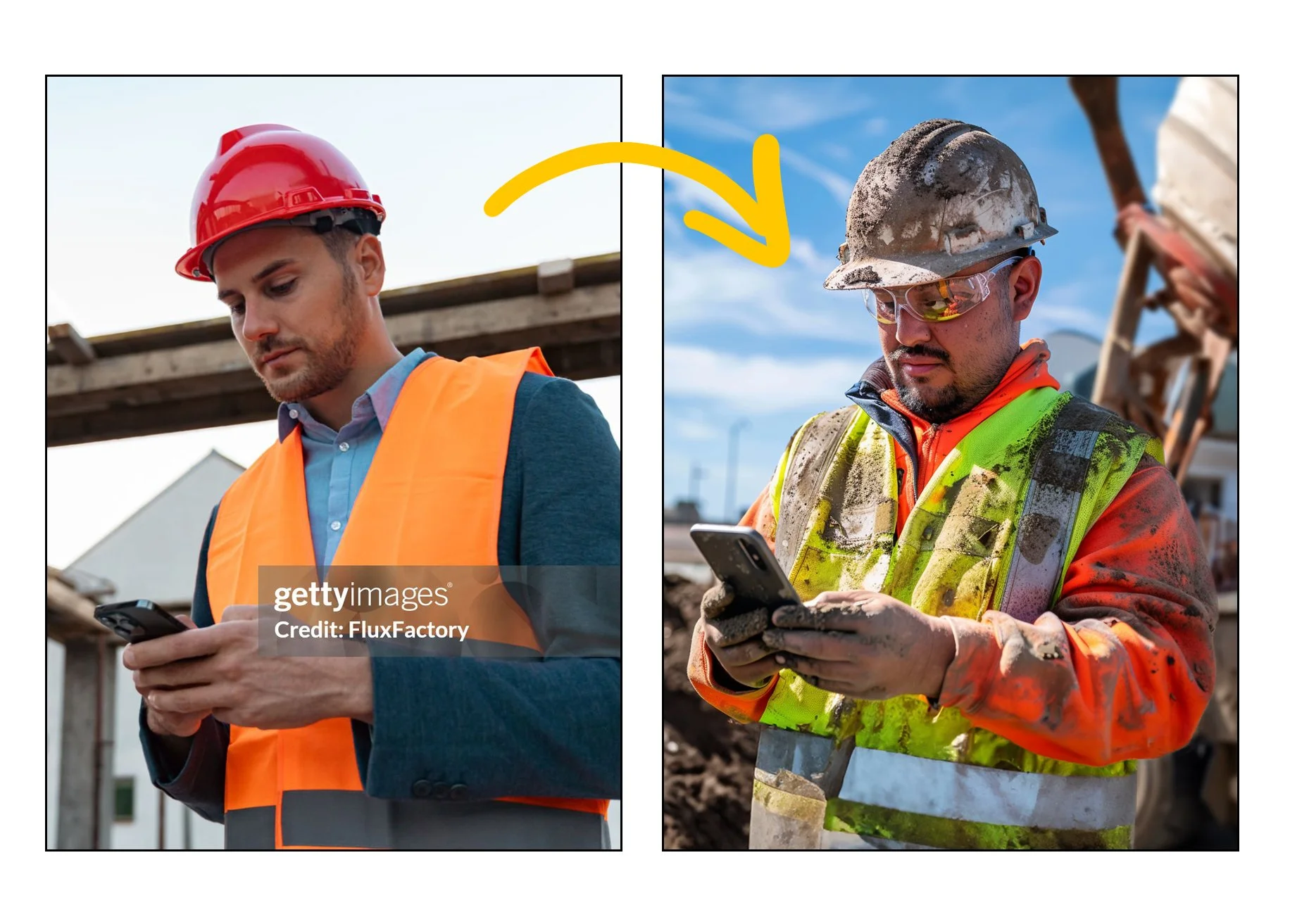 Construction sites have strict personal protective equipment requirements. Hard hats, safety glasses, high visibility vests, and even things like exposed rebar needing protective caps. These details are easy to overlook if you don't know to look for them, and both stock photography and AI generation overlook them constantly.