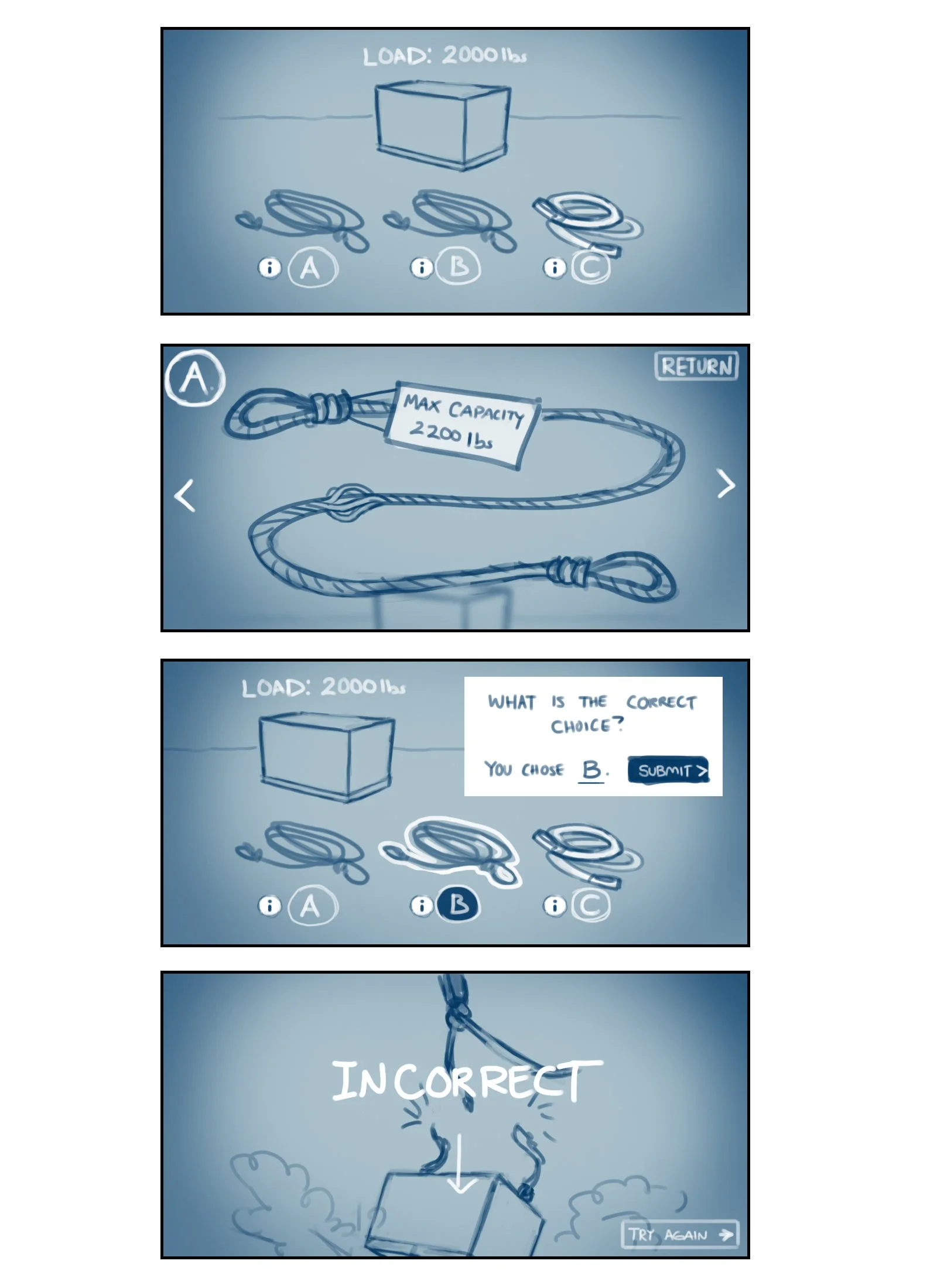 To cut down on last-minute edits and rework, I implemented a detailed storyboarding pass at the start of each project. I worked hand-in-hand with our design team to translate their ideas to drawings, allowing us to visualize and walk through entire courses prior to any of the art or voice-work being created. This work helped the design team and clients visualize their own thoughts while also giving the art team a clear map for what needed to be made.